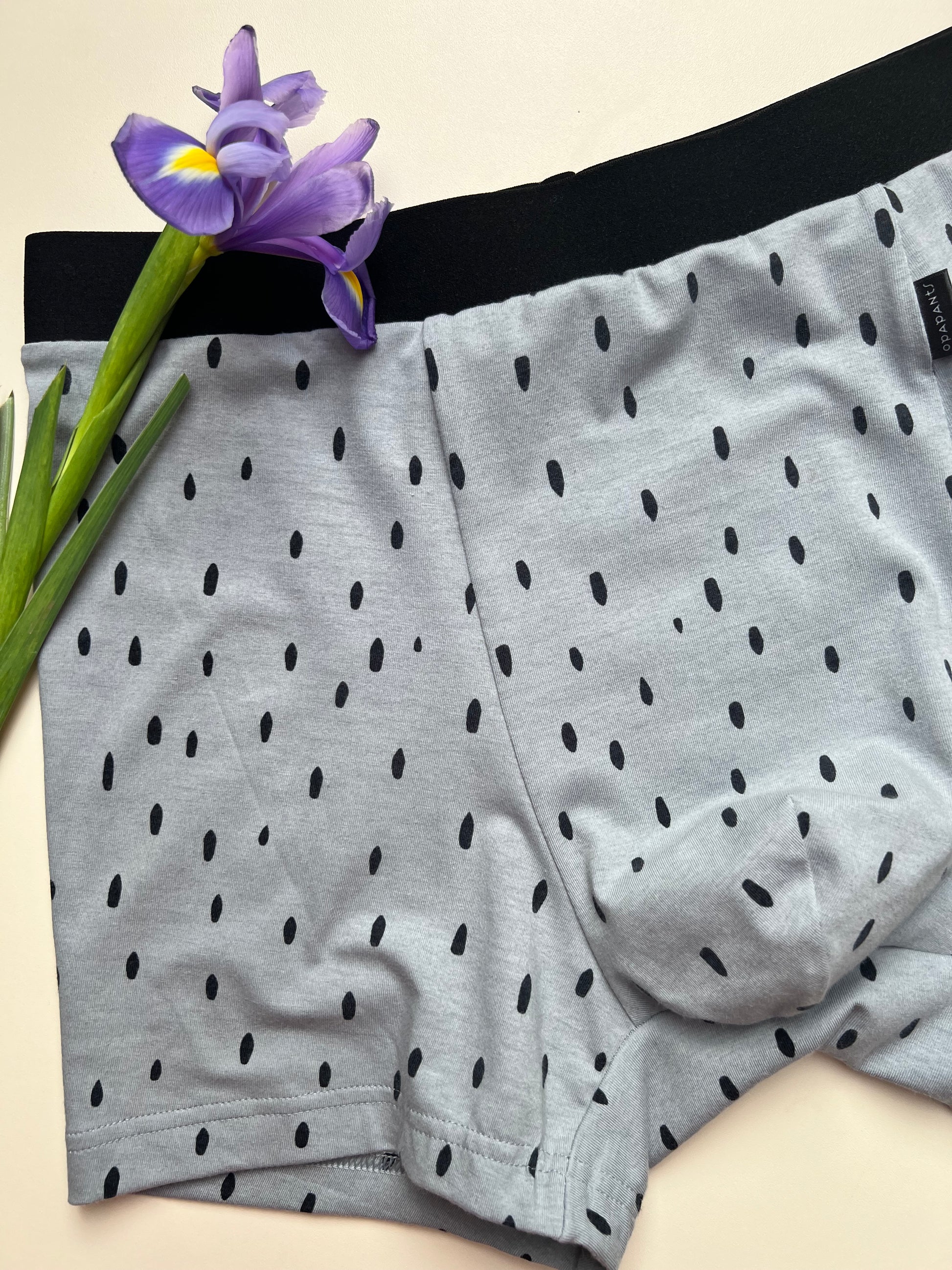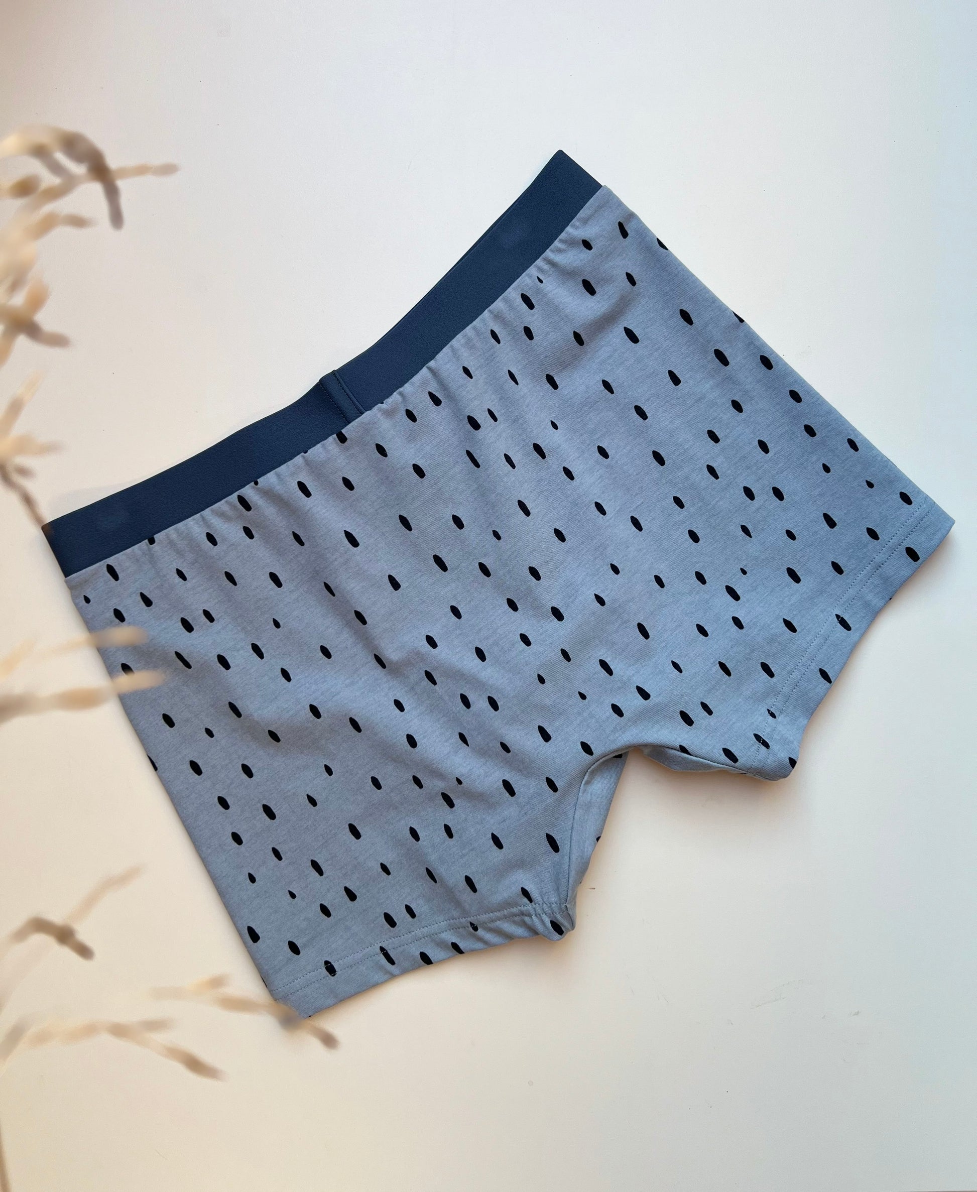 JAUNAIS modelis Organiskās kokvilnas vīriešu bezvīļu bokseršorti – dūmakaini zili ar melniem lāsumiem I 2 veidi