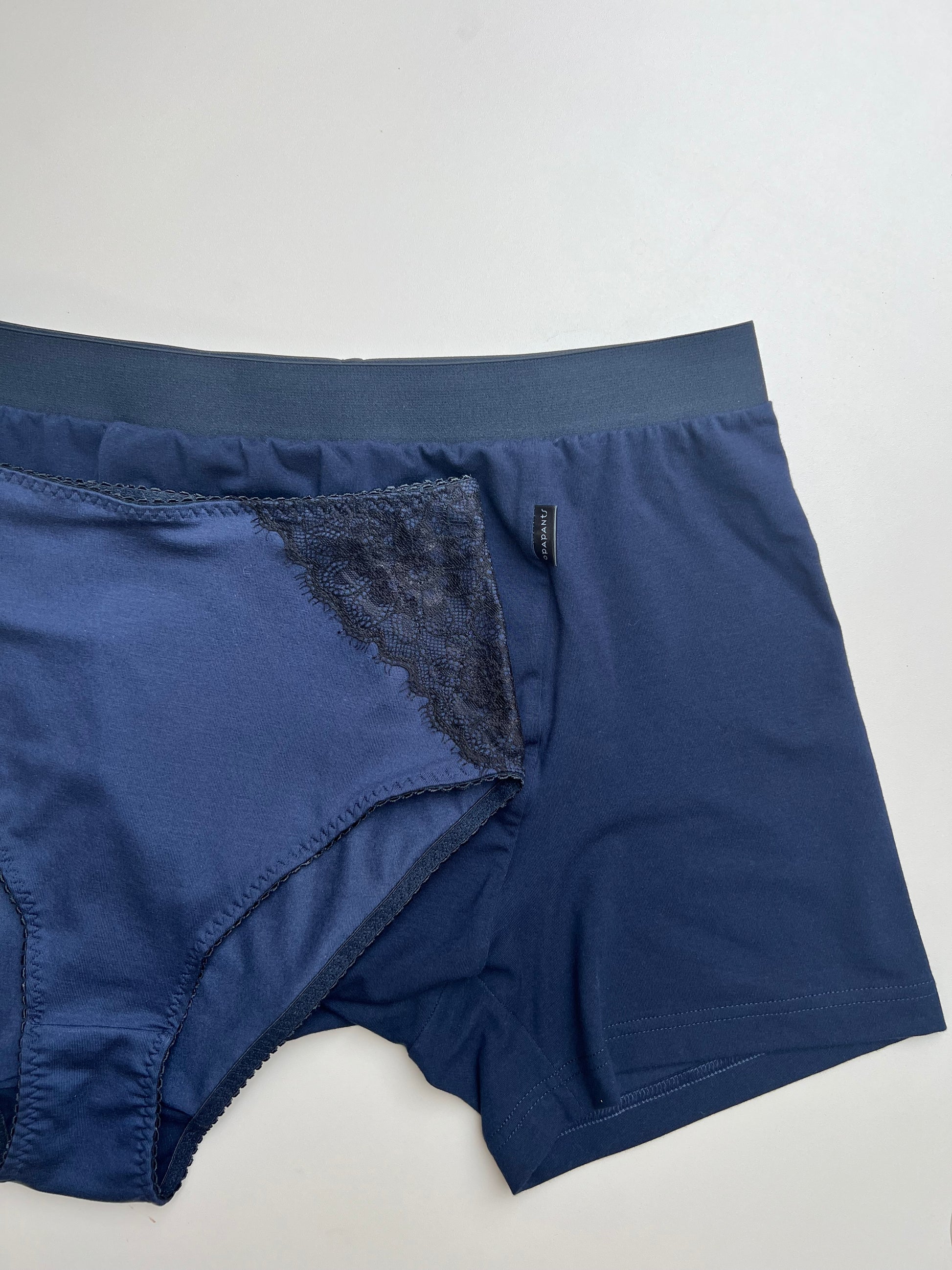 Sieviešu augstā vidukļa biksītes no TENCEL™ trikotāžas un pārstrādātas mežģīnes – tumši zilas ar melnu mežģīni